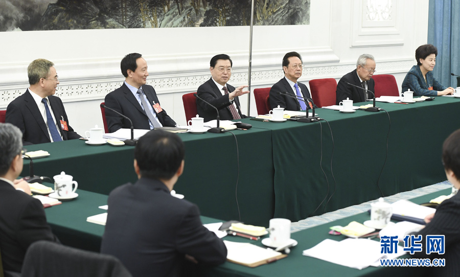3月10日,中共中央政治局常委、全國人大常委會委員長張德江參加十二屆全國人大五次會議寧夏代表團的審議。 新華社記者 高潔 攝