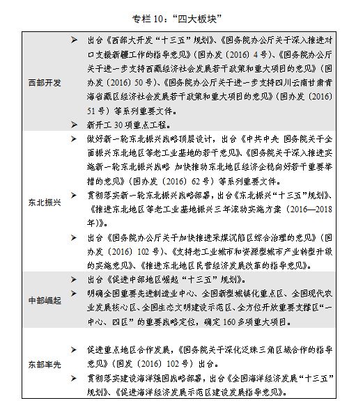 二是區(qū)域發(fā)展總體戰(zhàn)略和差別化區(qū)域政策深入實施。加快新一輪西部大開發(fā),一批重大標(biāo)志性工程開工建設(shè),中西部地區(qū)經(jīng)濟繼續(xù)保持較快增長。出臺實施新一輪東北振興戰(zhàn)略和若干重大政策舉措,國企改革、投資營商環(huán)境改善等重點領(lǐng)域改革取得新進展。明確中部地區(qū)“一中心、四區(qū)”重要戰(zhàn)略定位,長江中游城市群重要增長極作用強化。東部地區(qū)轉(zhuǎn)型升級、開放創(chuàng)新、陸海統(tǒng)籌優(yōu)勢持續(xù)發(fā)揮,區(qū)域發(fā)展新動能新亮點不斷涌現(xiàn)。出臺促進區(qū)域協(xié)調(diào)發(fā)展的指導(dǎo)意見,差別化區(qū)域政策體系持續(xù)完善。國家綜合配套改革試驗區(qū)、國家級新區(qū)及各類開發(fā)區(qū)、承接產(chǎn)業(yè)轉(zhuǎn)移示范區(qū)、產(chǎn)城融合示范區(qū)、臨空經(jīng)濟示范區(qū)等重要功能平臺建設(shè)有序推進。加快革命老區(qū)、民族地區(qū)、邊疆地區(qū)和集中連片特困地區(qū)脫貧攻堅。完善支持政策措施,推進新疆、西藏、四省藏區(qū)經(jīng)濟社會發(fā)展和長治久安。