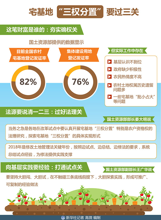 “這是一項重大的理論和實踐創(chuàng)新,為深化改革指明了方向?!眹临Y源部部長姜大明說,當(dāng)務(wù)之急是各地在改革試點中要認(rèn)真開展宅基地“三權(quán)分置”特別是農(nóng)戶資格權(quán)的法理研究,探索宅基地“三權(quán)分置”的具體實現(xiàn)形式。