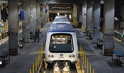 為了保證小火車安全運行,在位于地下十六米的首都機場博維公司維修車間,原本三節(jié)一組的列車被拆分開,十余位工作人員正在對捷運列車進行例行檢修。隨著千斤頂?shù)木徛还?jié)車廂被抬升到離地一米的高度,兩名工作人員持手電對車底進行檢修。工作人員介紹,在列車累計行駛達9600公里以上時都要進行一次系統(tǒng)檢修。