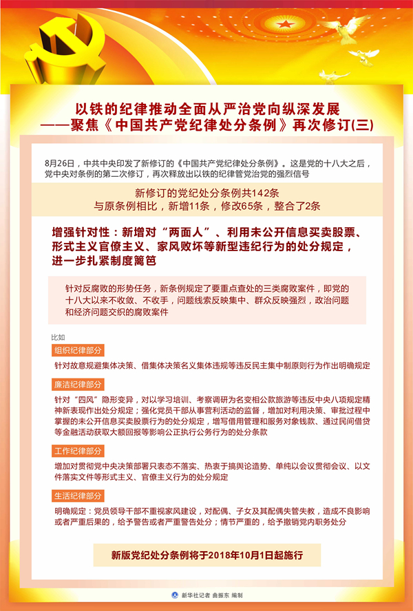 新版黨紀處分條例將于2018年10月1日起施行。它的頒布施行必將不斷提高紀律建設的政治性、時代性、針對性,以更加科學、更加嚴密、更加有效的思路舉措,推動全面從嚴治黨取得更大戰(zhàn)略性成果。