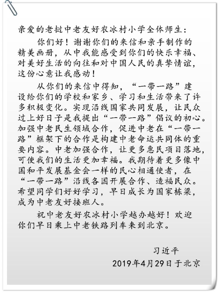 在來(lái)信的最后,中老友好農(nóng)冰村小學(xué)師生提及讓他們滿(mǎn)心期待的中老鐵路,希望以后能夠乘坐中老鐵路的列車(chē)去北京看看。