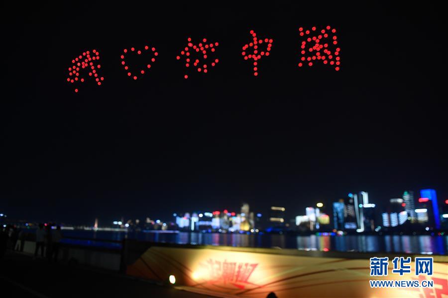 5月20日,約150架無人機空中編隊在錢塘江上空組成“我愛你中國”字樣。 當晚,在浙江杭州錢塘江畔,城市燈光秀和約150架無人機組成的空中編隊表演交相輝映?!?20中國”“我愛你中國”“70年”……對祖國進行的一場“深情告白”閃耀錢塘兩岸。 新華社記者黃宗治攝