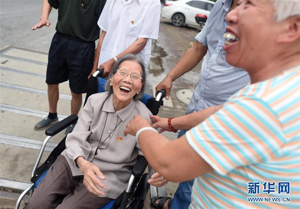 7月1日,呂銀芬(前右)來到七一村黨群服務(wù)中心參加“七一”主題黨日活動(dòng)。新華社記者 韓傳號(hào) 攝