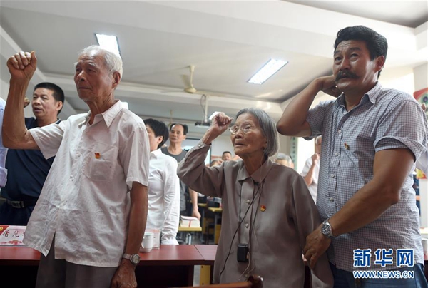 7月1日,呂銀芬(前中)等黨員在“七一”主題黨日活動(dòng)中重溫入黨誓詞。新華社記者 韓傳號(hào) 攝