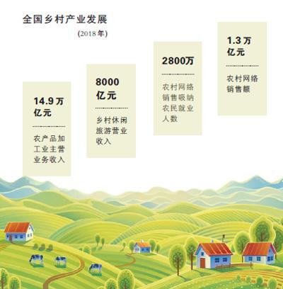 產(chǎn)業(yè)興旺是鄉(xiāng)村振興的基礎(chǔ),是解決農(nóng)村問(wèn)題的前提。黨的十八大以來(lái),鄉(xiāng)村產(chǎn)業(yè)呈現(xiàn)良好發(fā)展勢(shì)頭。2018年,糧食產(chǎn)能連續(xù)7年保持在1.2萬(wàn)億斤以上,農(nóng)產(chǎn)品加工業(yè)主營(yíng)業(yè)務(wù)收入達(dá)14.9萬(wàn)億元,鄉(xiāng)村休閑旅游營(yíng)業(yè)收入超過(guò)8000億元,農(nóng)業(yè)生產(chǎn)性服務(wù)業(yè)營(yíng)業(yè)收入超過(guò)2000億元,農(nóng)村網(wǎng)絡(luò)銷售額1.3萬(wàn)億元,返鄉(xiāng)下鄉(xiāng)創(chuàng)新創(chuàng)業(yè)人員累計(jì)達(dá)780萬(wàn)。