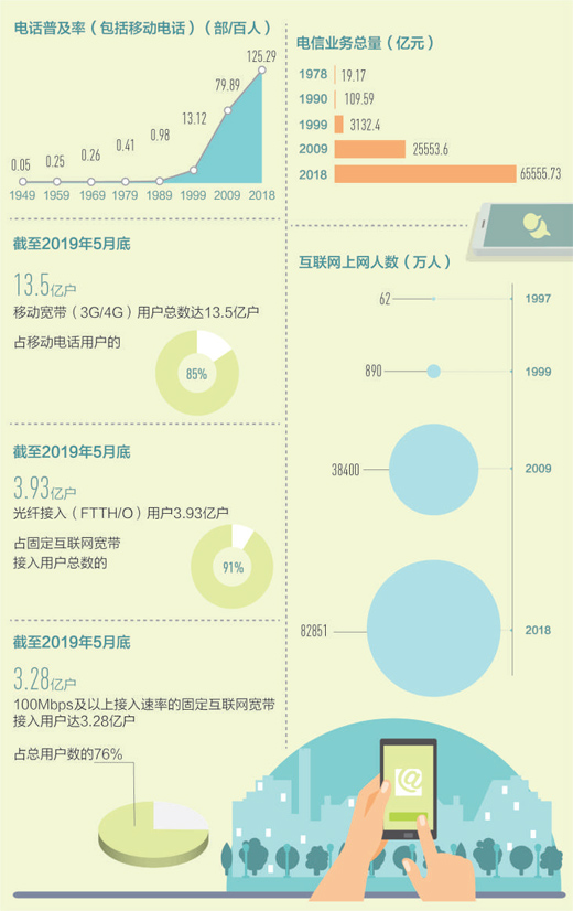 從單一種類到多種通信方式并存。2018年,我國(guó)電話普及率(包括移動(dòng)電話)為125.29部/百人,固定互聯(lián)網(wǎng)寬帶接入用戶40738萬戶,移動(dòng)寬帶用戶130565萬戶,互聯(lián)網(wǎng)上網(wǎng)人數(shù)從1997年的62萬人迅速上升至82851萬人。用得上、用得起、用得好的信息服務(wù)正在惠及更多百姓,億萬人民在共享互聯(lián)網(wǎng)發(fā)展成果上擁有更多獲得感、幸福感和安全感。