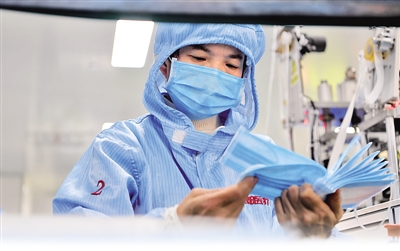 近日,河南省長垣市的醫(yī)用防護用品生產企業(yè)爭分奪秒全力趕制醫(yī)用產品。圖為工作人員在生產車間內加工口罩。新華社發(fā)(郝源攝)