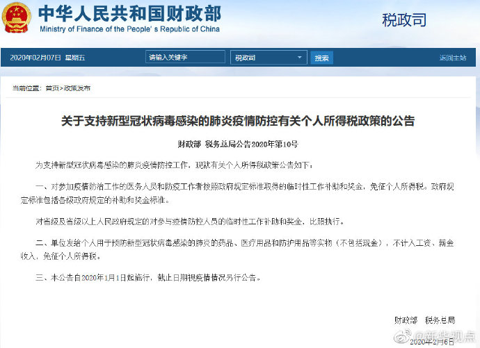 財政部、國家稅務(wù)總局7日對外聯(lián)合發(fā)布公告,明確對參加疫情防治工作的醫(yī)務(wù)人員和防疫工作者按照政府規(guī)定標(biāo)準(zhǔn)取得的臨時性工作補(bǔ)助和獎金,免征個人所得稅。單位發(fā)給個人用于預(yù)防新型冠狀病毒感染的肺炎的藥品、醫(yī)療用品和防護(hù)用品等實(shí)物(不包括現(xiàn)金),不計入工資、薪金收入,免征個人所得稅。(記者劉紅霞、郁瓊源)?
