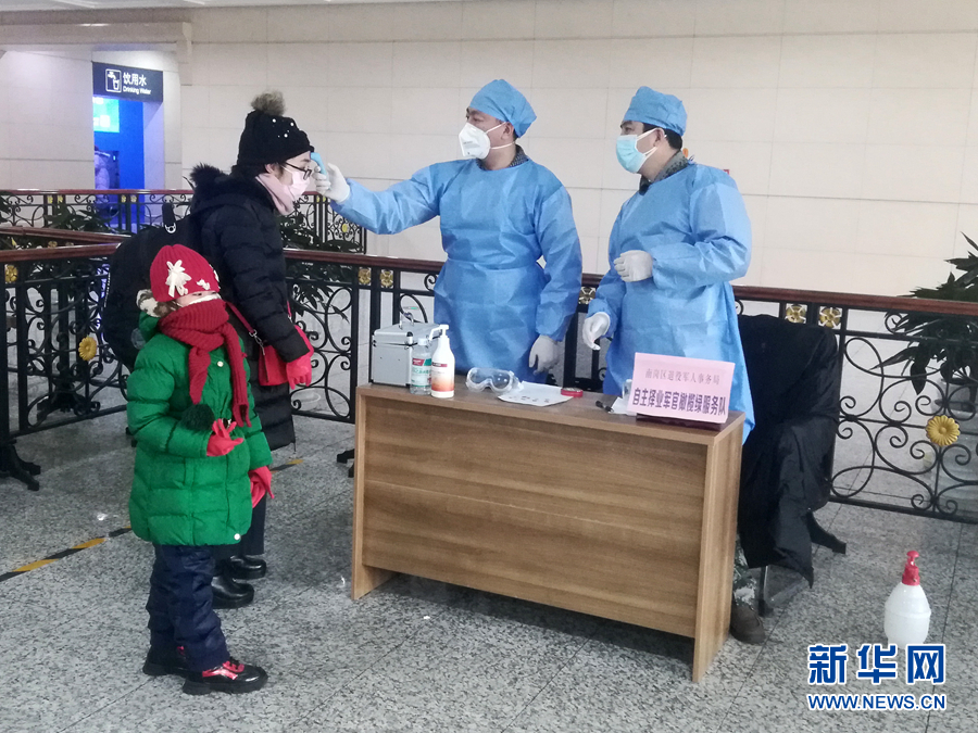 2月14日,黑龍江哈爾濱68名自主擇業(yè)軍轉(zhuǎn)干部組成的“橄欖綠疫情防控志愿服務(wù)隊(duì)”隊(duì)員在火車站為旅客測(cè)量體溫。 新華社發(fā)(韓振忠 攝)
