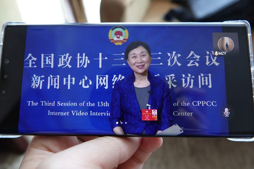 20日,記者通過(guò)手機(jī)觀看全國(guó)政協(xié)委員接受采訪。