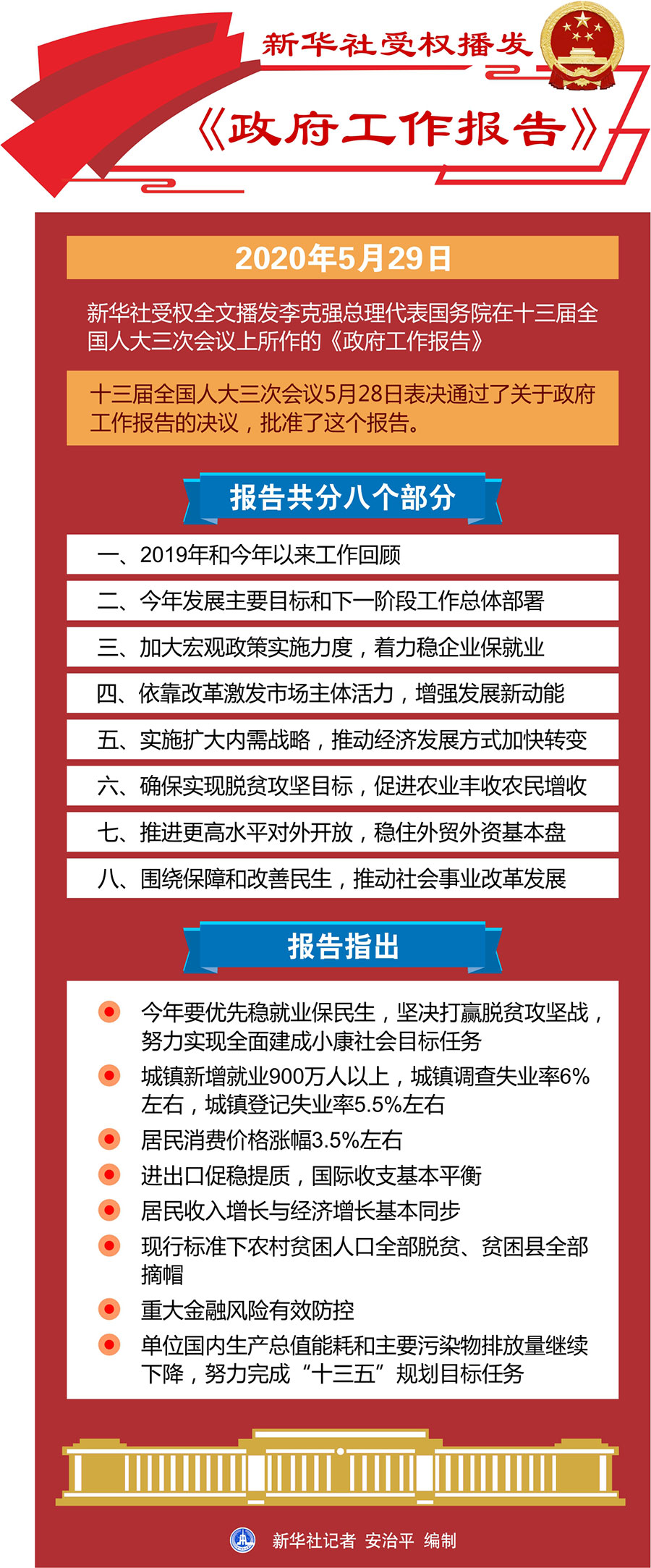報告共分八個部分:一、2019年和今年以來工作回顧;二、今年發(fā)展主要目標和下一階段工作總體部署;三、加大宏觀政策實施力度,著力穩(wěn)企業(yè)保就業(yè);四、依靠改革激發(fā)市場主體活力,增強發(fā)展新動能;五、實施擴大內需戰(zhàn)略,推動經(jīng)濟發(fā)展方式加快轉變;六、確保實現(xiàn)脫貧攻堅目標,促進農(nóng)業(yè)豐收農(nóng)民增收;七、推進更高水平對外開放,穩(wěn)住外貿(mào)外資基本盤;八、圍繞保障和改善民生,推動社會事業(yè)改革發(fā)展。