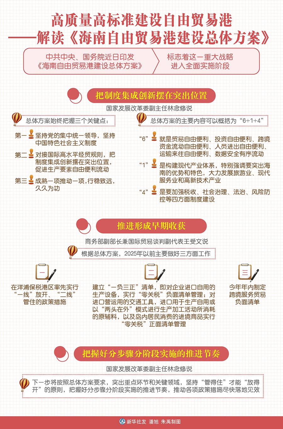 林念修說,總體方案的推進實施分為打基礎(chǔ)和全面推進兩個階段。從現(xiàn)在起到2025年以前主要是打基礎(chǔ)、做準(zhǔn)備。突出貿(mào)易投資自由化便利化,推動各類要素便捷高效流動,形成早期收獲,適時啟動全島封關(guān)運作。“爭取用3年左右取得突破性進展,為全面封關(guān)奠定良好基礎(chǔ)。”