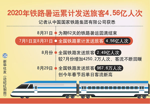 新華社北京9月1日電(記者樊曦)記者從中國國家鐵路集團(tuán)有限公司獲悉,8月31日,為期62天的鐵路暑運(yùn)圓滿結(jié)束。7月1日至8月31日,全國鐵路累計(jì)發(fā)送旅客4.56億人次。