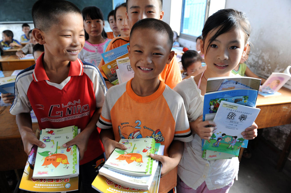 ↑ 這是2008年9月1日,江西樟樹市第二小學五(1)班鄧文?。ㄖ校┑韧瑢W領到免費教科書。