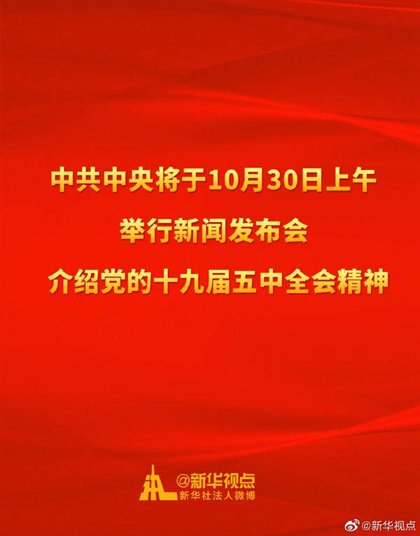 中共中央將于10月30日上午10時舉行新聞發(fā)布會,介紹黨的十九屆五中全會精神。