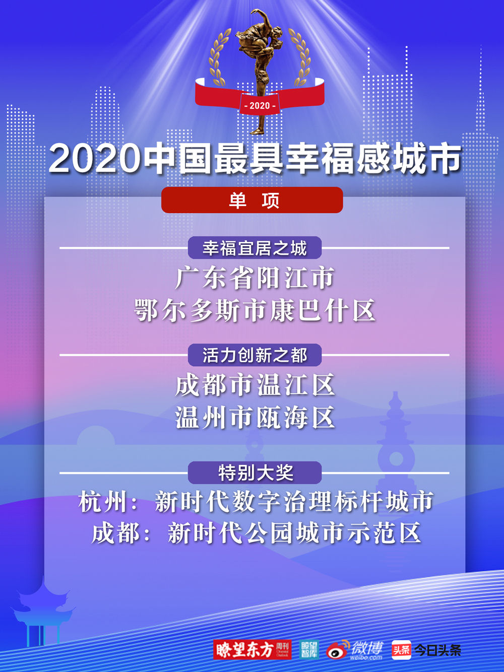 鑒于成都和杭州在城市治理方面的突出成就,組委會(huì)特別授予成都“新時(shí)代公園城市示范區(qū)”稱號(hào)、杭州 “新時(shí)代數(shù)字治理標(biāo)桿城市”稱號(hào)。另外,根據(jù)材料申報(bào)和大數(shù)據(jù)單項(xiàng)調(diào)查,廣東省陽江市、鄂爾多斯市康巴什區(qū)被評(píng)為“幸福宜居之城”,成都市溫江區(qū)、溫州市甌海區(qū)被評(píng)為“活力創(chuàng)新之都”。