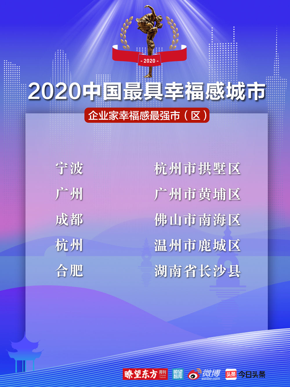 根據(jù)主觀調(diào)查問卷對(duì)企業(yè)主(家)幸福感的調(diào)查結(jié)果,組委會(huì)評(píng)選寧波、廣州、成都、杭州、合肥、杭州市拱墅區(qū)、廣州市黃埔區(qū)、佛山市南海區(qū)、溫州市鹿城區(qū)、湖南省長沙縣為“企業(yè)家幸福感最強(qiáng)市(區(qū))”。