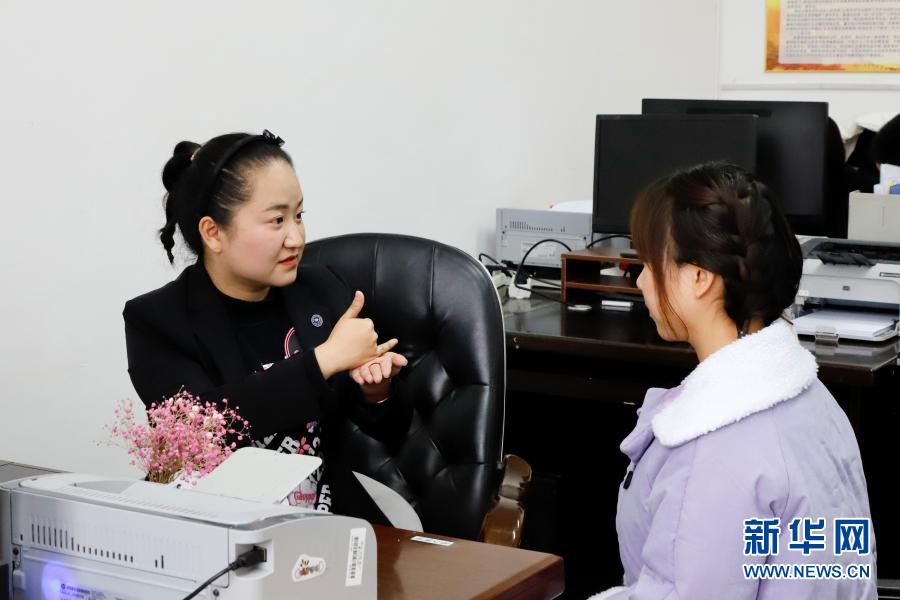 11月18日,在黑龍江綏化學(xué)院,李澤卉(左)用手語(yǔ)和學(xué)生交流。新華社發(fā)(黃龍斌 攝)