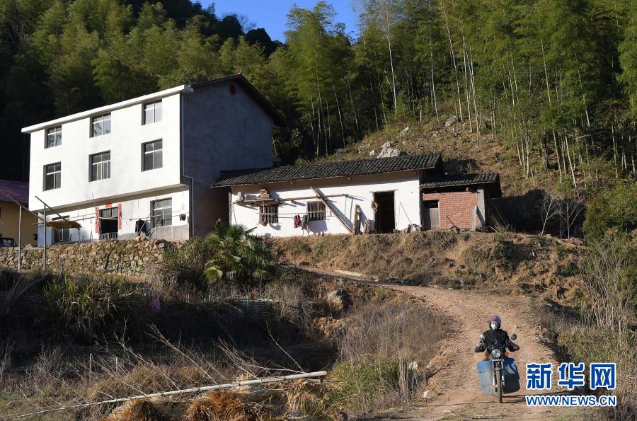 在江西省萬載縣高村鎮(zhèn)新竹村,新竹小學(xué)的校長(zhǎng)羅長(zhǎng)石為學(xué)生郭仕錢送完課程之后繼續(xù)趕路,去下一家送課(2月17日攝)。新華社記者 彭昭之 攝