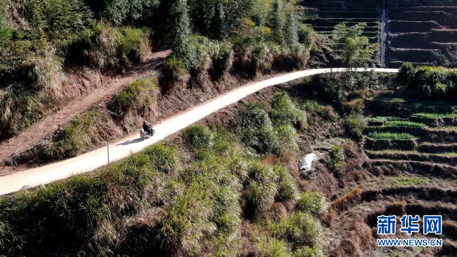 在江西省萬載縣高村鎮(zhèn)新竹村,新竹小學(xué)的校長(zhǎng)羅長(zhǎng)石騎行在山路上(2月17日攝,無人機(jī)照片)。他要去最偏遠(yuǎn)的村組,給學(xué)生送當(dāng)天的線上教學(xué)課程。新華社記者 彭昭之 攝