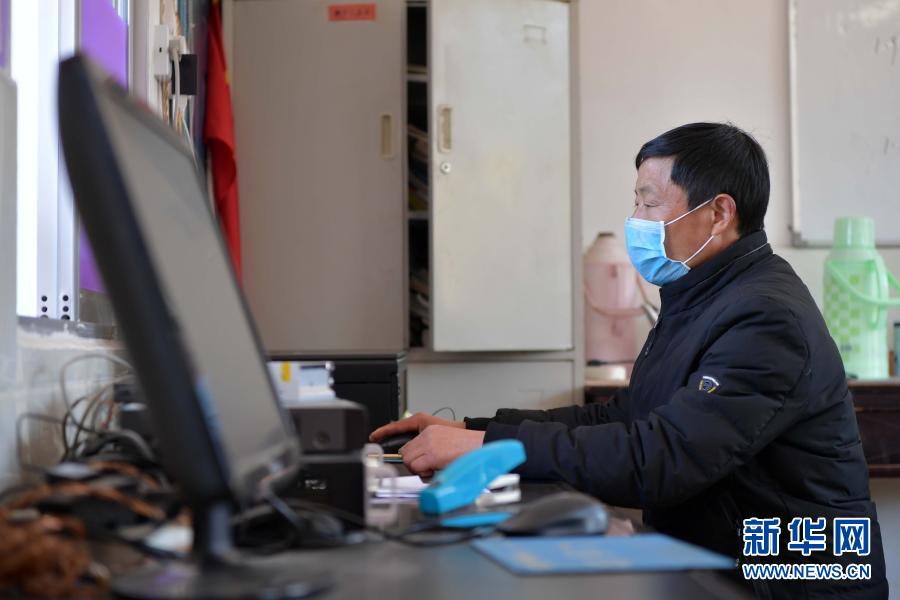在江西省萬載縣高村鎮(zhèn)新竹村新竹小學(xué),校長(zhǎng)羅長(zhǎng)石邊播邊錄當(dāng)天的線上教育課程(2月17日攝)。新華社記者 彭昭之 攝