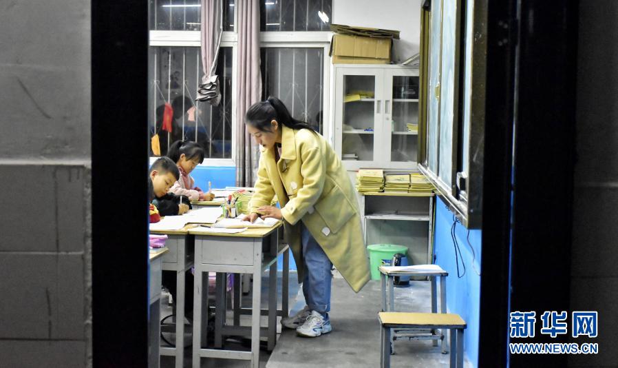 11月17日晚,在河南省洛陽市嵩縣德亭鎮(zhèn)酒店小學(xué),王予川檢查學(xué)生作業(yè)。新華社記者 韓朝陽 攝