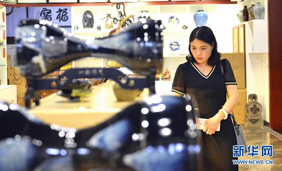 觀眾在河南省平頂山市魯山縣花瓷藝術(shù)館內(nèi)欣賞花瓷工藝品(7月27日攝)。新華社發(fā)(王克偉 攝)