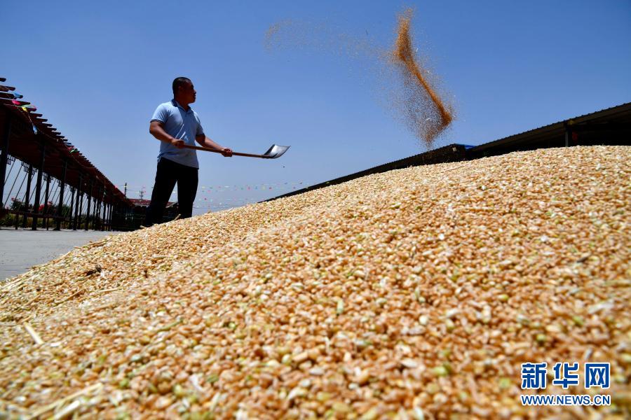 在山東省汶上縣郭倉鎮(zhèn),種糧大戶郭波波在晾曬小麥(6月3日攝)。
