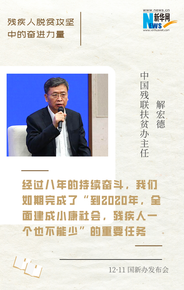 解宏德是中國殘聯(lián)扶貧辦主任。五年來,全程參與了殘疾人脫貧攻堅工作。他介紹,在殘疾人脫貧攻堅這條戰(zhàn)線上,各級殘聯(lián)組織將殘疾人脫貧攻堅作為最重要、最緊迫、最艱巨的一項政治任務來抓。經(jīng)過八年的持續(xù)奮斗,我國將如期完成“到2020年,全面建成小康社會,殘疾人一個也不能少”的重要任務,現(xiàn)行標準下農(nóng)村貧困殘疾人將如期全部脫貧,消除殘疾人絕對貧困。