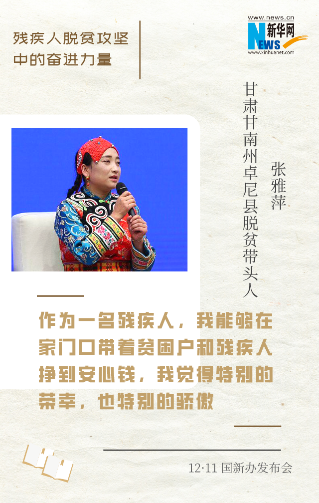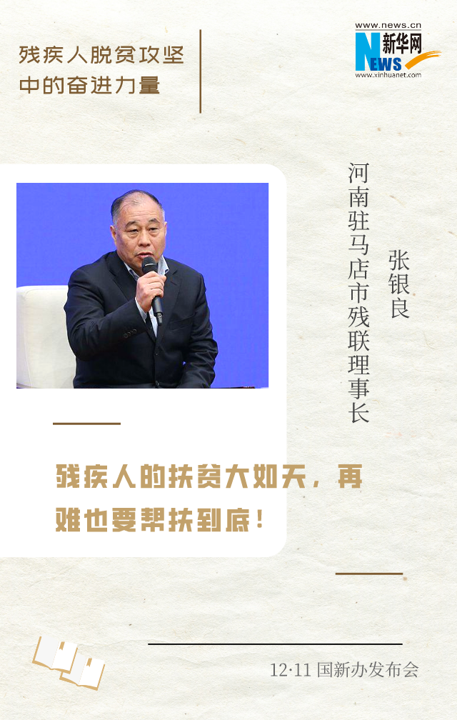 新華網(wǎng)北京12月11日電(王瑩)在脫貧攻堅的戰(zhàn)場上,涌現(xiàn)出許多殘疾人自強脫貧的先進典型和脫貧攻堅一線奮力拼搏的工作者。12月11日上午,國新辦邀請到他們中的4位代表,圍繞“殘疾人脫貧攻堅中的奮進力量”與中外記者見面交流。一起來聽他們的脫貧故事和脫貧經(jīng)驗。