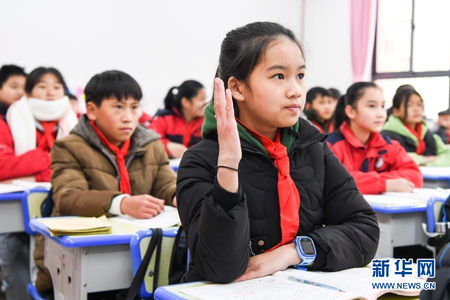 廣西羅城·深圳實(shí)驗(yàn)小學(xué)六年級學(xué)生潘欣怡(前)在課堂上舉手回答問題(12月16日攝)。新華社記者 曹祎銘 攝