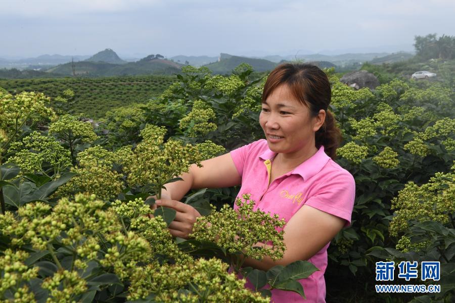 廣西羅城仫佬族自治縣小長安鎮(zhèn)民族村村委會主任覃鳳瓊在查看吳茱萸長勢(6月21日攝)。新華社發(fā)(韋如代 攝)