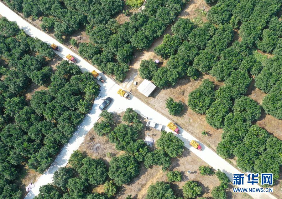 在廣西羅城仫佬族自治縣金玉柚生態(tài)產(chǎn)業(yè)扶貧示范區(qū),裝載柚子的車輛在柚子園內(nèi)行駛(無人機(jī)照片,2019年11月5日攝)。新華社記者 陸波岸 攝