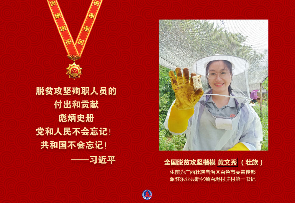 黃文秀同志把青春和熱血都獻(xiàn)給了脫貧攻堅(jiān)事業(yè),以實(shí)際行動(dòng)詮釋了共產(chǎn)黨人的初心和使命,用短暫而精彩的人生譜寫(xiě)了一曲新時(shí)代共產(chǎn)黨員的奉獻(xiàn)之歌。2019年6月17日犧牲在脫貧攻堅(jiān)一線(xiàn),年僅30歲。