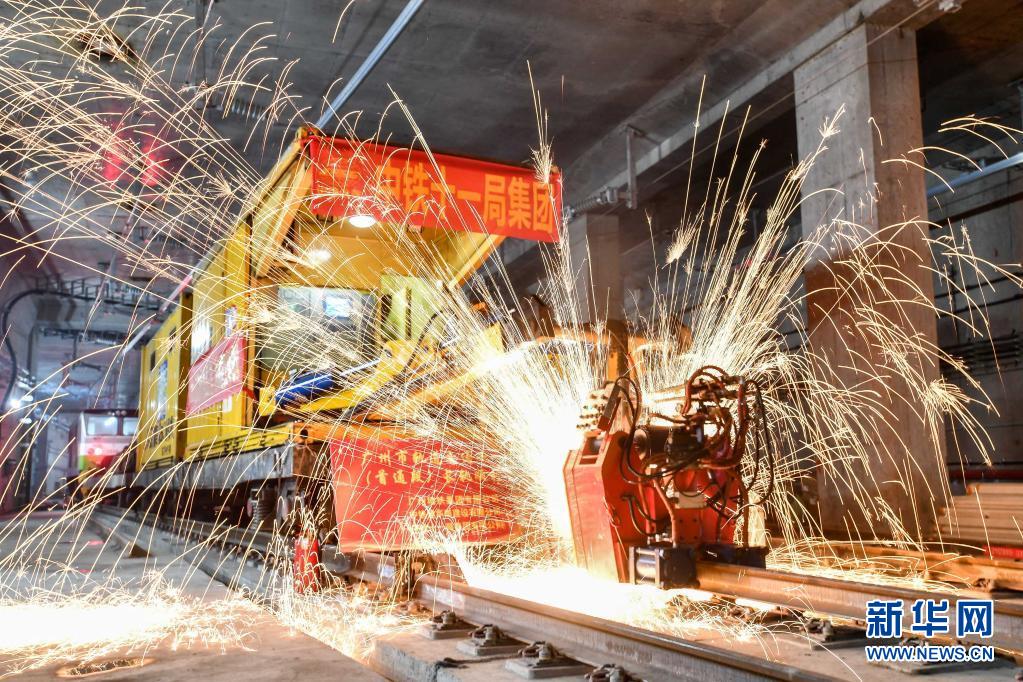 中鐵十一局軌道焊機(jī)在焊接廣州地鐵18號線首通段最后一個鋼軌接頭(2021年4月20日攝)。新華社記者 劉大偉 攝