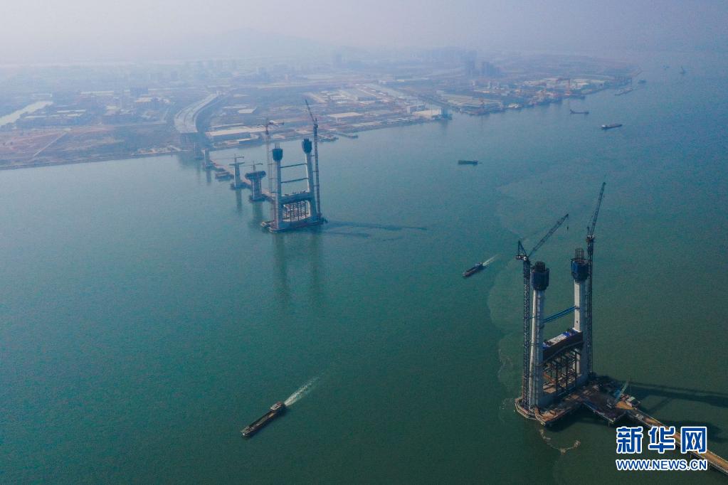 2021年2月2日,深中通道橫門大橋兩端的非通航孔橋?qū)⑹褂?0米混凝土箱梁(無人機(jī)照片)。當(dāng)日,深中通道項(xiàng)目首榀60米混凝土箱梁在位于中山市馬鞍島的中鐵大橋局深中通道項(xiàng)目智慧梁場澆筑成功。新華社記者 劉大偉 攝
