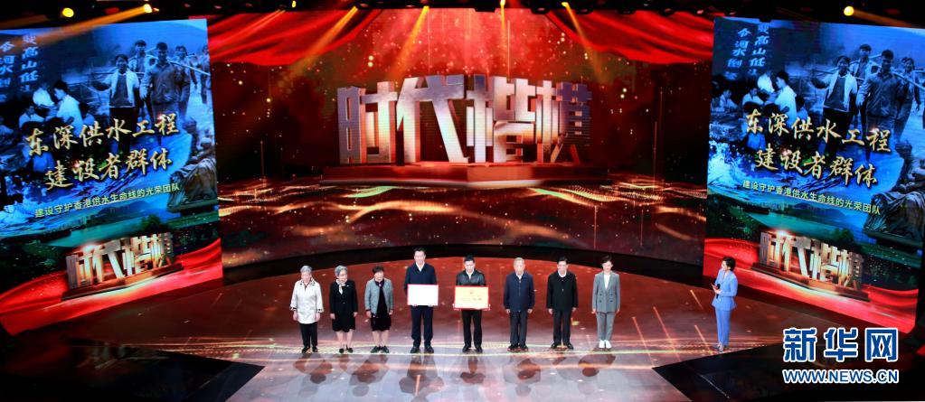 東深供水工程建設(shè)者群體代表在“時代楷模”發(fā)布儀式上領(lǐng)取“時代楷?!豹勁坪妥C書(2021年4月18日攝)。新華社記者 潘旭 攝