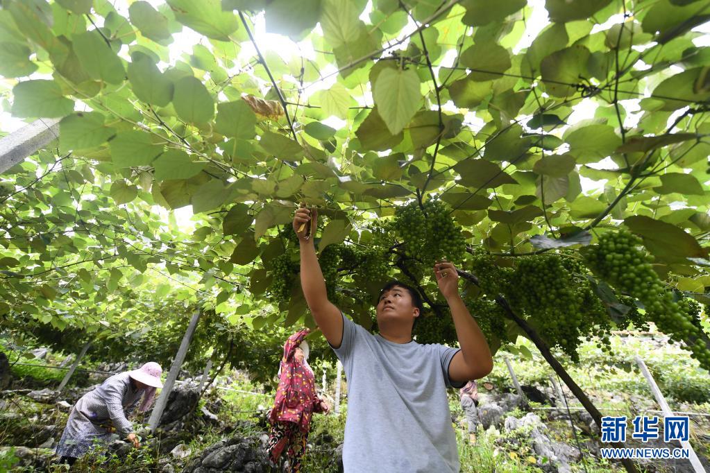 在廣西都安瑤族自治縣下坳鎮(zhèn)隆壩村龍磊屯的毛葡萄示范基地,村民在管護葡萄(2019年7月24日攝)。新華社記者 陸波岸 攝