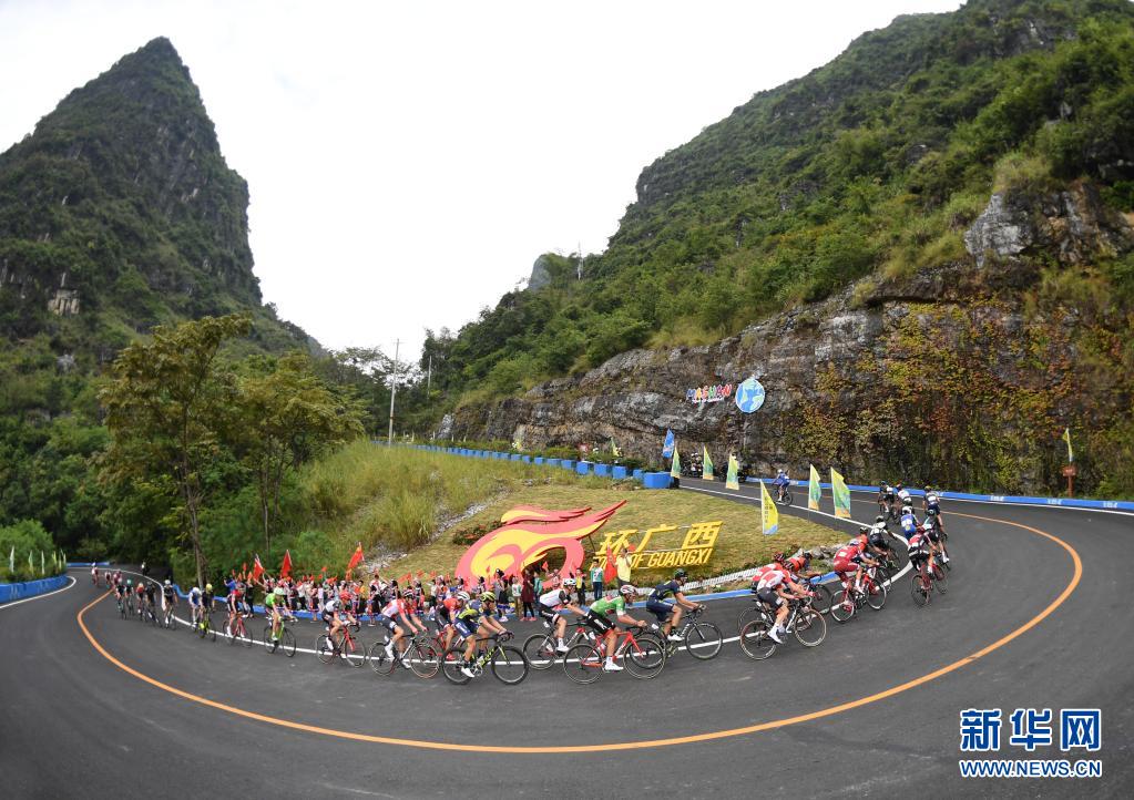 在2017環(huán)廣西公路自行車世界巡回賽中,參賽選手經(jīng)過馬山縣古零鎮(zhèn)古零村弄拉屯路段(2017年10月22日攝)。新華社記者 陸波岸 攝