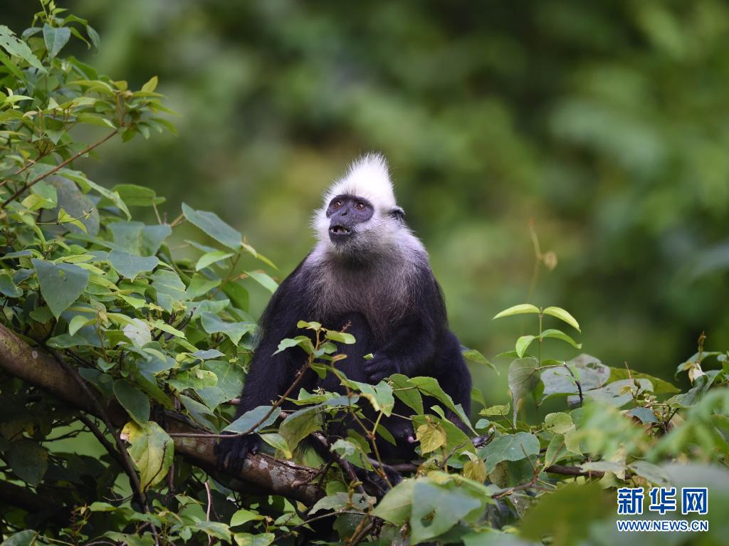 廣西崇左白頭葉猴國家級自然保護區(qū)板利片區(qū)一處山坳里,在族群覓食的時候,猴王警惕地觀察周圍環(huán)境(2016年8月6日攝)。新華社記者 周華 攝