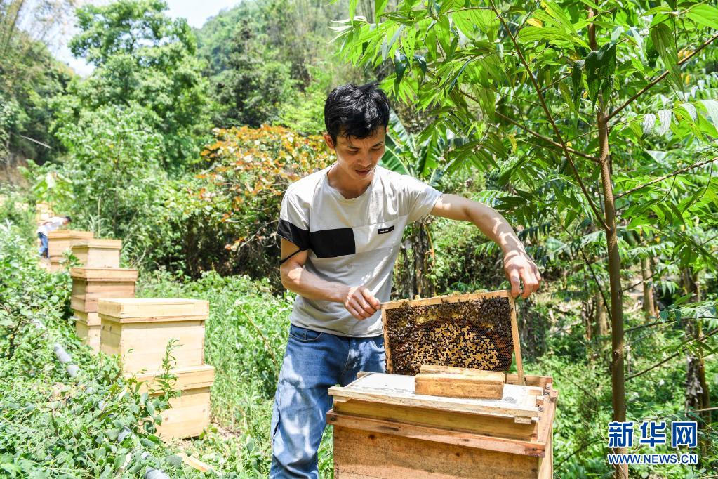 廣西百色市樂業(yè)縣新化鎮(zhèn)百坭村村民班華六在查看蜂巢(2020年4月20日攝)。新華社記者 曹祎銘 攝