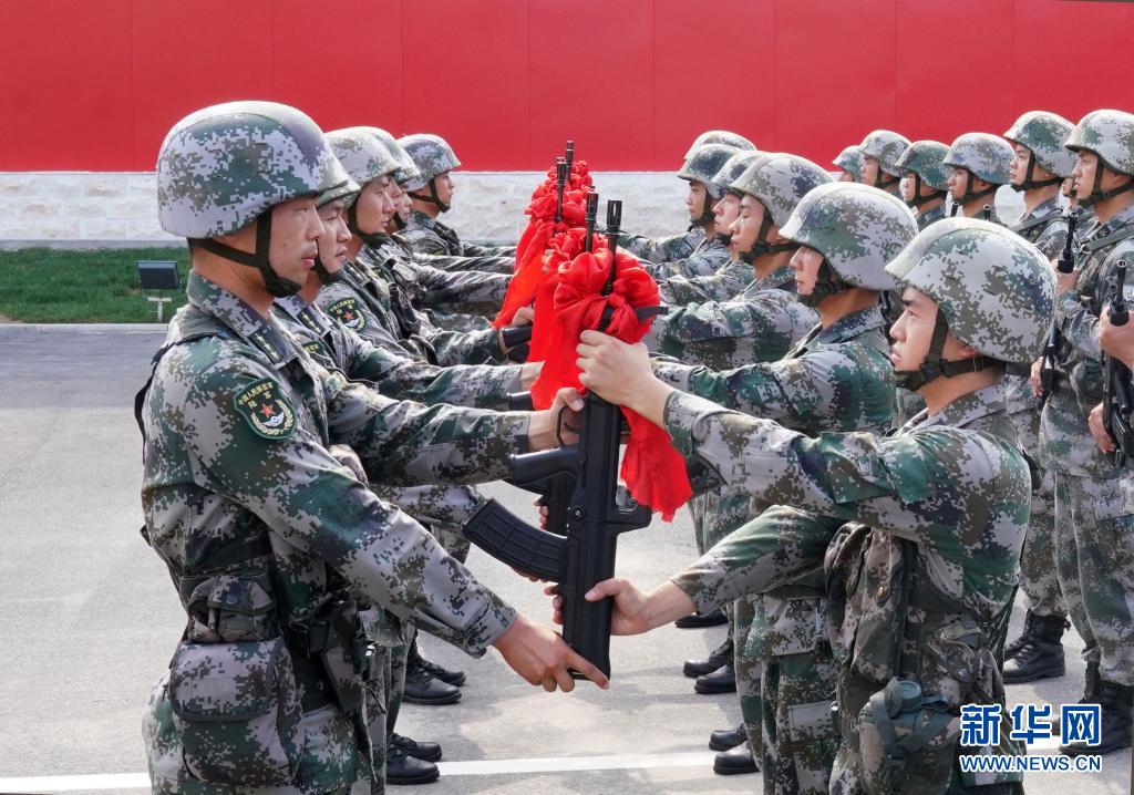 陸軍第83集團(tuán)軍某旅“紅一連”黨支部為新戰(zhàn)士舉行授槍儀式(7月4日攝)。新華社記者 張永進(jìn) 攝