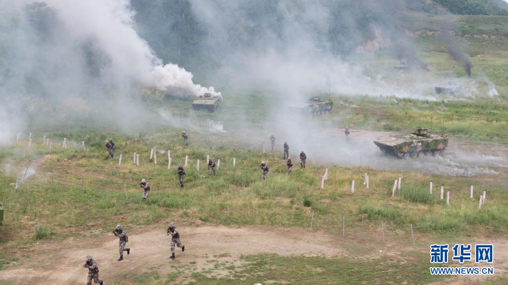 對(duì)抗演練中,陸軍第83集團(tuán)軍某旅“紅一連”官兵突破“敵”陣地前沿(無(wú)人機(jī)照片,7月4日攝)。新華社發(fā)(姜東坡攝)