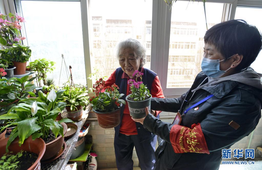 北京市豐臺(tái)區(qū)東高地街道黨員志愿者馮春紅(右)上門(mén)看望社區(qū)內(nèi)高齡老人王康鳳,了解老人居家生活情況(2020年4月1日攝)。新華社記者 李欣 攝