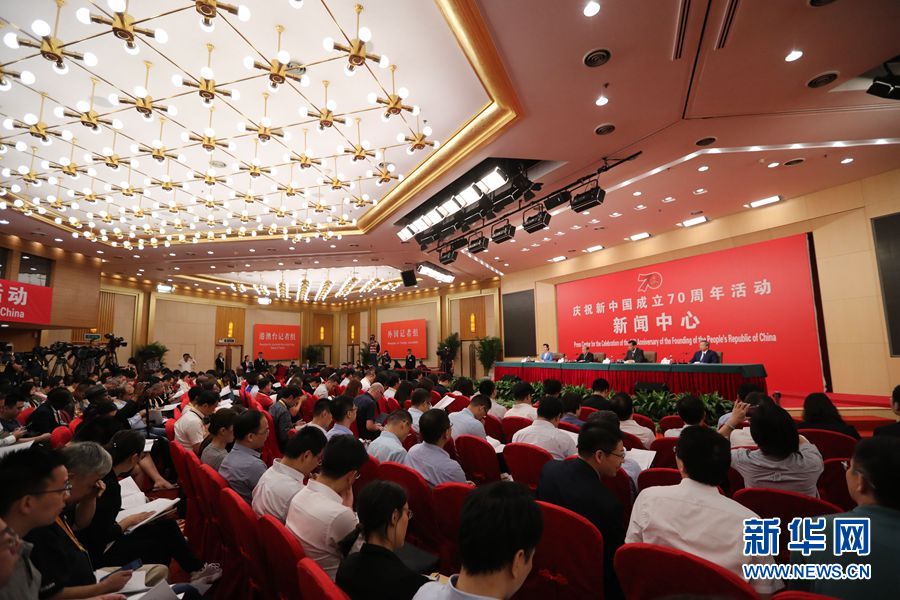 9月24日,慶祝中華人民共和國成立70周年活動新聞中心在北京梅地亞中心二層新聞發(fā)布廳舉辦第一場新聞發(fā)布會。圖為新聞發(fā)布會現(xiàn)場。新華網(wǎng)記者 陳競超 攝