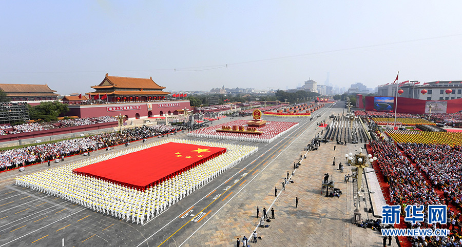 在陣陣歡呼聲中,由1949名青年組成的國旗方陣、2019名青年組成的國慶年號和國徽方陣依次走來。