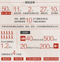 這次閱兵,我軍共編50個方(梯)隊。其中,徒步方隊11個,抗戰(zhàn)老同志乘車方隊2個、裝備方隊27個、空中梯隊10個,兵力正式受閱約1.2萬人,擬動用40多種型號裝備500多件、20多種型號飛機近200架……