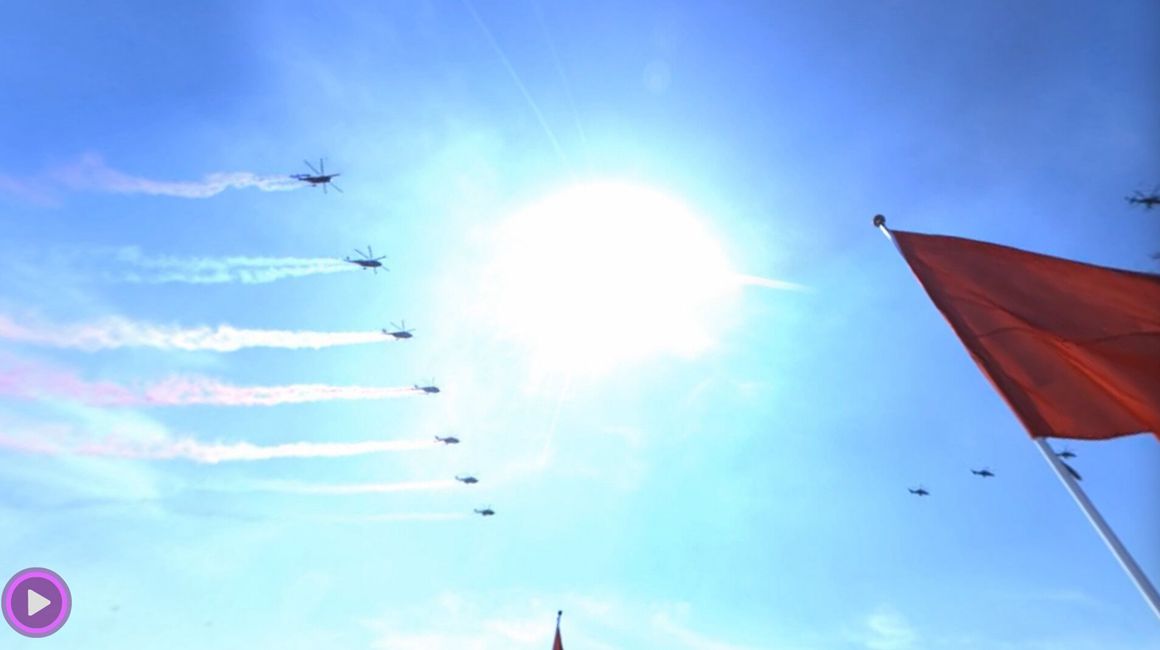 蔚藍的天空中,6架直升機護衛(wèi)著國旗和軍旗、20架直升機飛成“70”字樣、7架教練機拉出7道彩煙——率先從天安門廣場飛過的空中護旗方隊,揭開了勝利日大閱兵的序幕。9月3日,雄偉的天安門,寬闊的長安街,見證著這場大閱兵的一個又一個精彩瞬間。