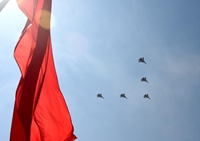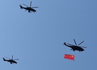 中國利用神舟飛船返回著陸的降落傘技術制造了巨幅國旗和軍旗。9月3日紀念抗戰(zhàn)勝利70周年的大閱兵中,直升機懸掛著這兩面旗幟,以每小時180公里的速度飛過天安門。國旗長9米、寬6米,軍旗長7.5米、寬6米。這是中國首次懸掛如此巨大的旗幟,以如此高的速度飛行展示。